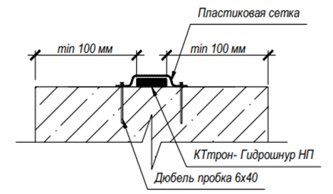 Удалить антиадгезионную бумагу с профиля КТтрон-Гидрошнур БТ23 и плотно уложить профиль на бетонную поверхность, зафиксировать от возможных смещений при помощи механического крепления (сетка серпянка и дюбель-пробки). Шаг крепления – от 100 до 400 мм в зависимости от неровности поверхности (рисунок 1).